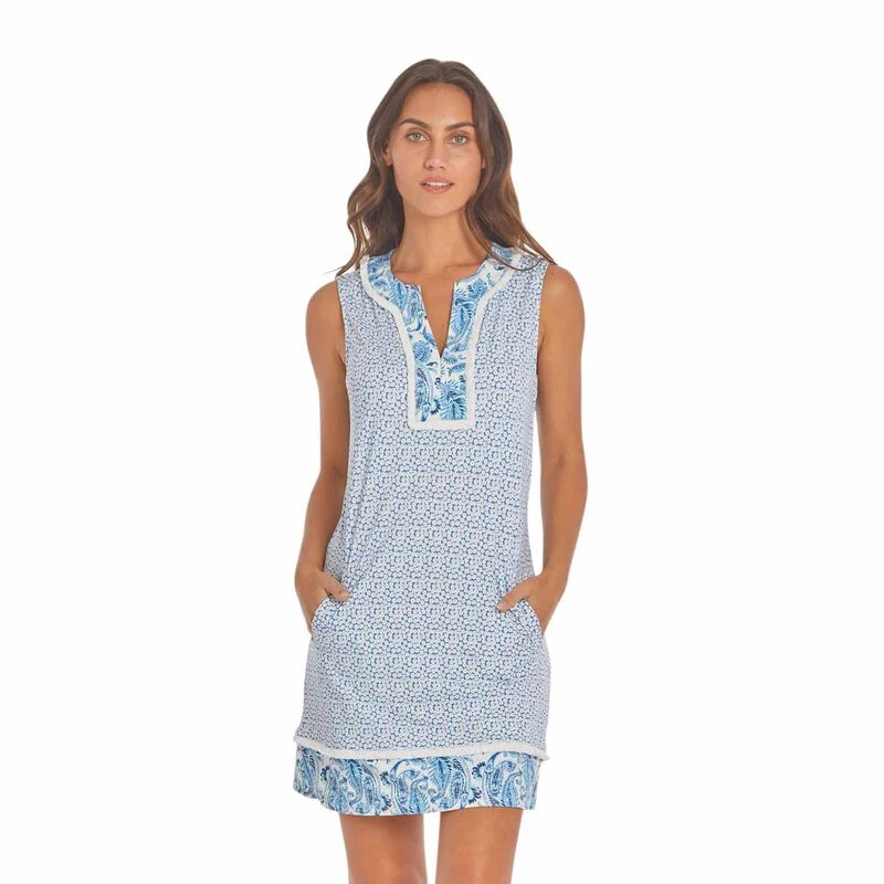 This tunic dress will be your new favorite dress or cover up with a flattering sleeveless design in our fun prints. The patterned and tassels add a pop of color to this elegant dress. Made with our luxurious lightweight UPF 50+ fabric that easily takes you from sand to sidewalk. Imported.