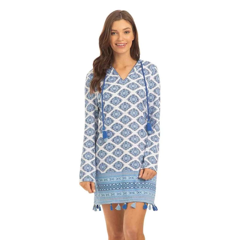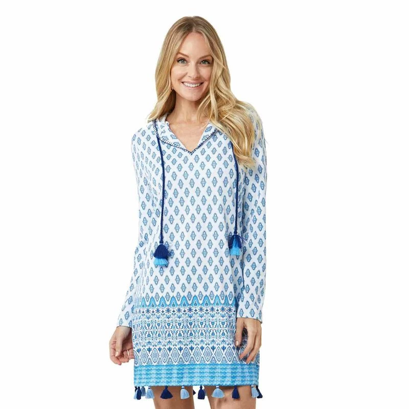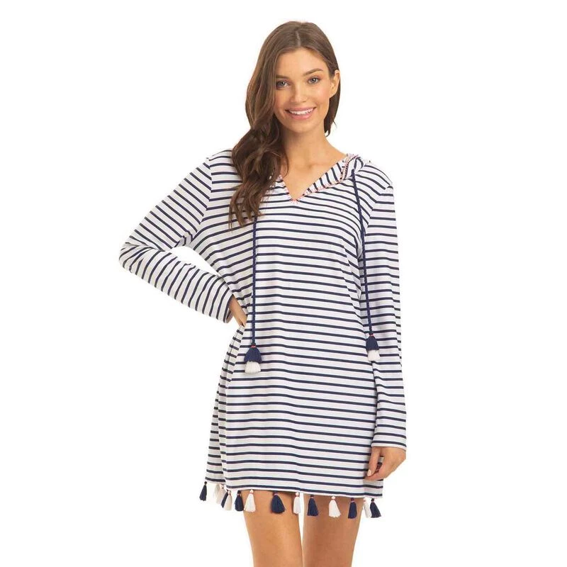 This fun and fashionable cover up is about to be your new fave! The drawstring tassels and pom-pom fringe will make this your go to cover up to go from the boat to land or beach to boardwalk. Imported.