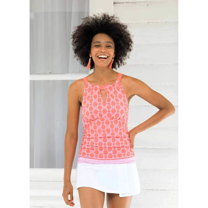 Inspired by our best-selling sleeveless shift dress, this high neck tankini top is trendy and flattering. It features ample coverage and built-in bra cups that will provide support by the pool or ocean. The cutout at the neckline provides added detail & elegance. Pairs with the Bikini Bottoms or white swim skirts and shorts. Imported.