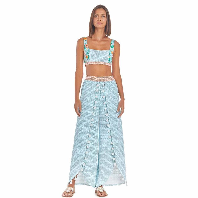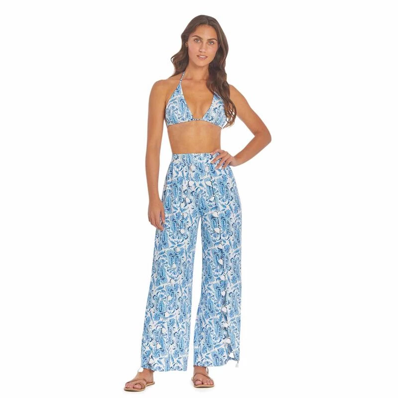 These Palazzo Pants are cut with a loose, wide leg that flares out from the waist for a casual yet elegant look. The side slits at the bottom of the pant legs allow the pants to flatter & move with you in each step. It is the perfect pant for the summer season as they are loose yet flattering in our light Nylon/Spandex fabric. Pair with a Bikini Top for a beach day or a Dolman Rashguard for cooler weather & extra sun protection. Imported.