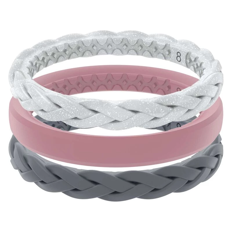 Interwoven braids of deep stone and pearl surround the soft mauve inner ring to create the perfect combination of color and texture. Whether you’re a fierce mama or you’re flying solo, this set of three rings will add some subtle color to your life. Just like their other Groove Life rings, these stackable rings have breathable inner grooves to allow air in and moisture out, giving you the perfect mix of style and comfortability for any season.