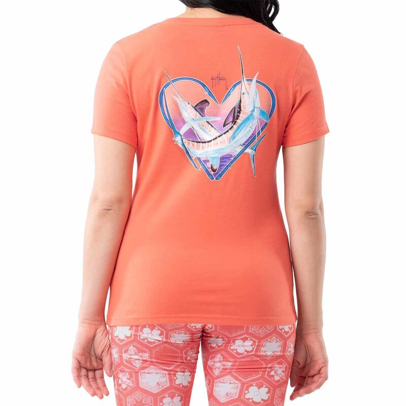 Guy Harvey uses his background as a marine biologist, angler and diver to create authentic depictions of sea species. Here he offers a beautiful design of 2 Marlins forming a heart shape on the back of this ladies short sleeve tee. Made of 100% cotton, you’re sure to stay cool all day, whether you’re fishing or strolling by the ocean. A great look over shorts, skorts or your swimsuit. Machine washable. Help Save our Oceans! Your purchase supports the health of our oceans and marine life. A portion of the proceeds from the sale of all official Guy Harvey merchandise benefits the Guy Harvey Ocean Foundation, which conducts scientific research and hosts educational programs to help save our seas. Imported.