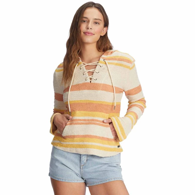 The best time to wear a striped poncho hoodie is all the time! Crafted from soft, comfortable woven terry fabric, the slightly oversized sweater features an allover print with bright shades of ochre yellow and toast nut brown. Complete with a lace-up neckline and kangaroo pocket.